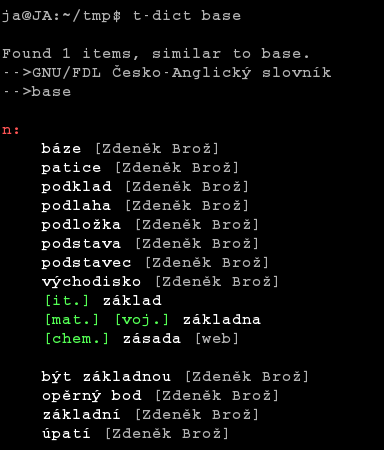 stardict je docela mily a vcelku pouzitelny slovnik, ale nic ve zlem, podpora pro prikazovou radku asi nebyla primarni. ono se staci podivat na vystup SDCV, coz neni nic jineho nez html a kdyz jsem se dival do vnitr, neni to chyba SDCV, proste ty tagy se tam nekde objevi a nechci radsi patrat kde...